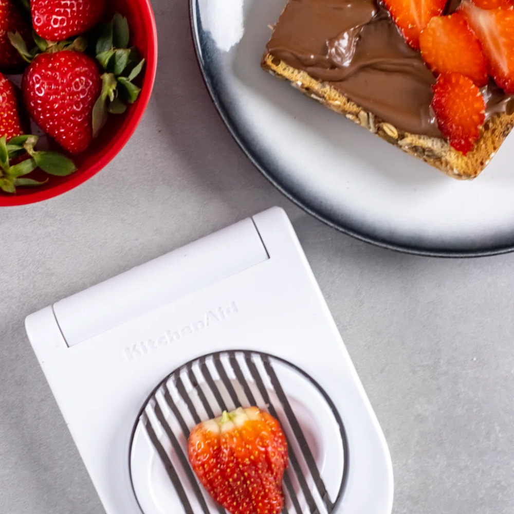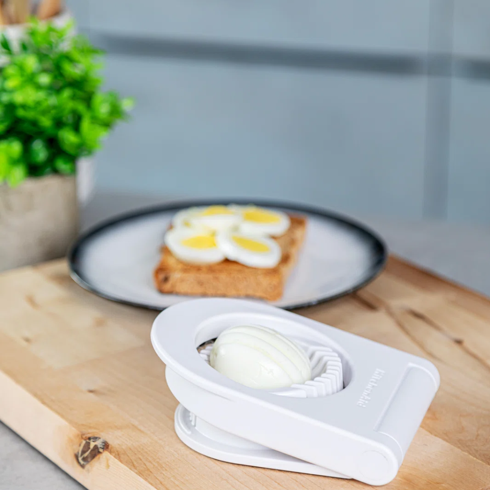 - Δημιουργήστε ομοιόμορφες φέτες σκληρά βρασμένα αυγά με τον κόφτη αυγών KitchenAid σε λευκό χρώμα.