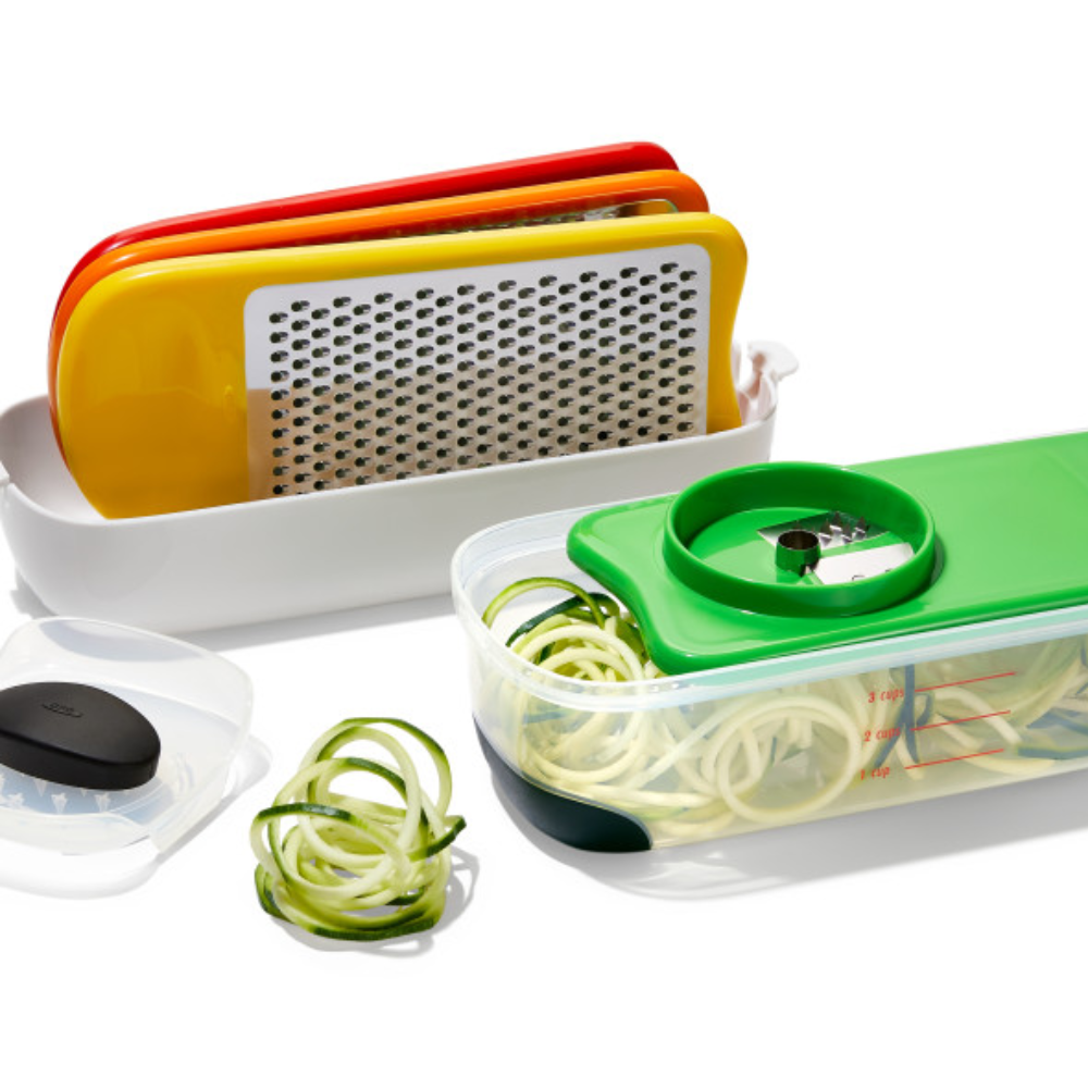 Ο OXO Χειροκίνητος Κόφτης Λαχανικών 3 σε 1 είναι η τέλεια λύση για γρήγορη προετοιμασία των λαχανικών σας. Με τρεις λεπίδες, μπορείτε να κάνετε σχεδόν οποιαδήποτε κόψιμο χωρίς να χρειάζεται να λερώσετε ένα ατελείωτα εργαλεία κουζίνας. Ο κόφτης δημιουργεί ομοιόμορφα ζυμαρικά λαχανικών από κολοκυθάκια, καρότα και άλλα, ο τεμαχιστής αποδίδει ομοιόμορφες φέτες φρούτων και λαχανικών, ο μεσαίος τρίφτης κάνει αφράτα τρίμματα από σκληρά τυριά και σοκολάτα και ο χοντρός τρίφτης είναι τέλειος για ημίμαλακο τυρί, βούτυρο, κρεμμύδια και άλλα. Τα αντιολισθητικά πόδια κρατούν το δοχείο σταθερό και η θήκη φαγητού προστατεύει το χέρι σας κατά την κοπή. Το δοχείο λειτουργεί ως καπάκι όταν αποθηκεύετε τις λεπίδες τακτοποιημένα μέσα στο σετ.