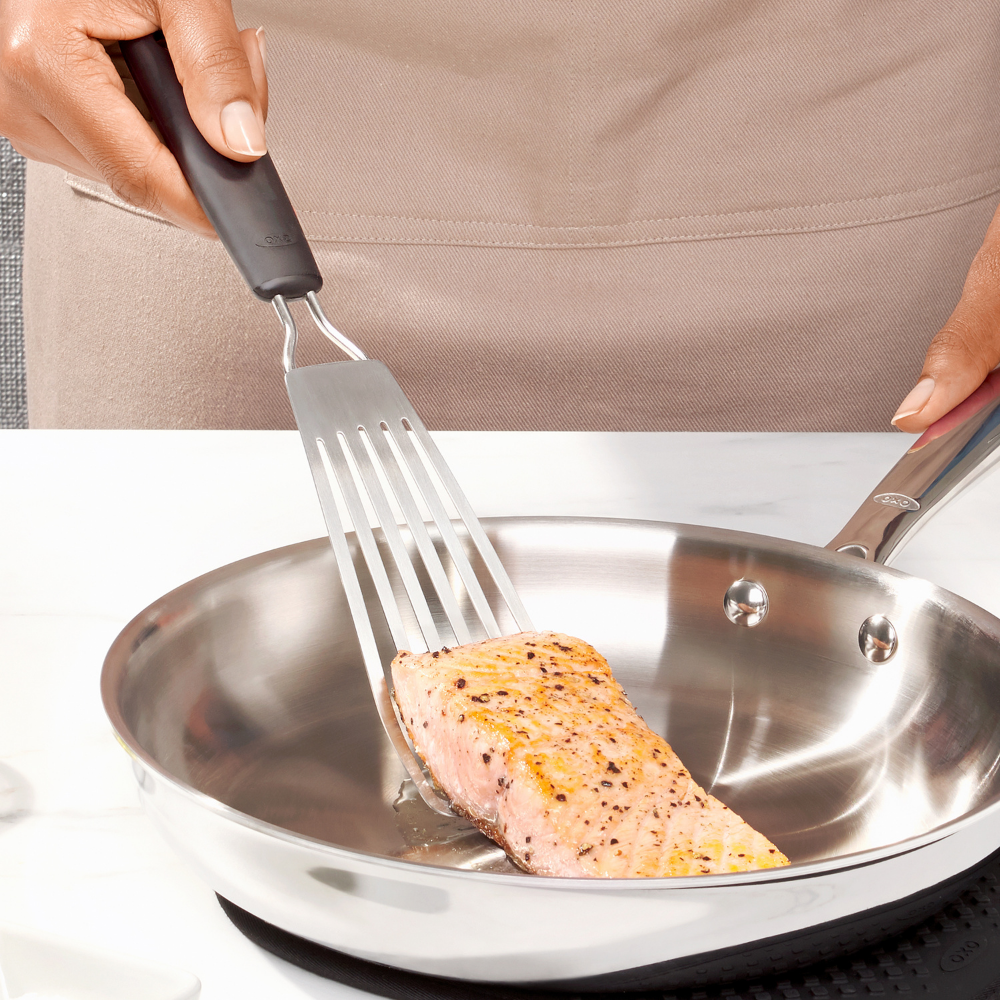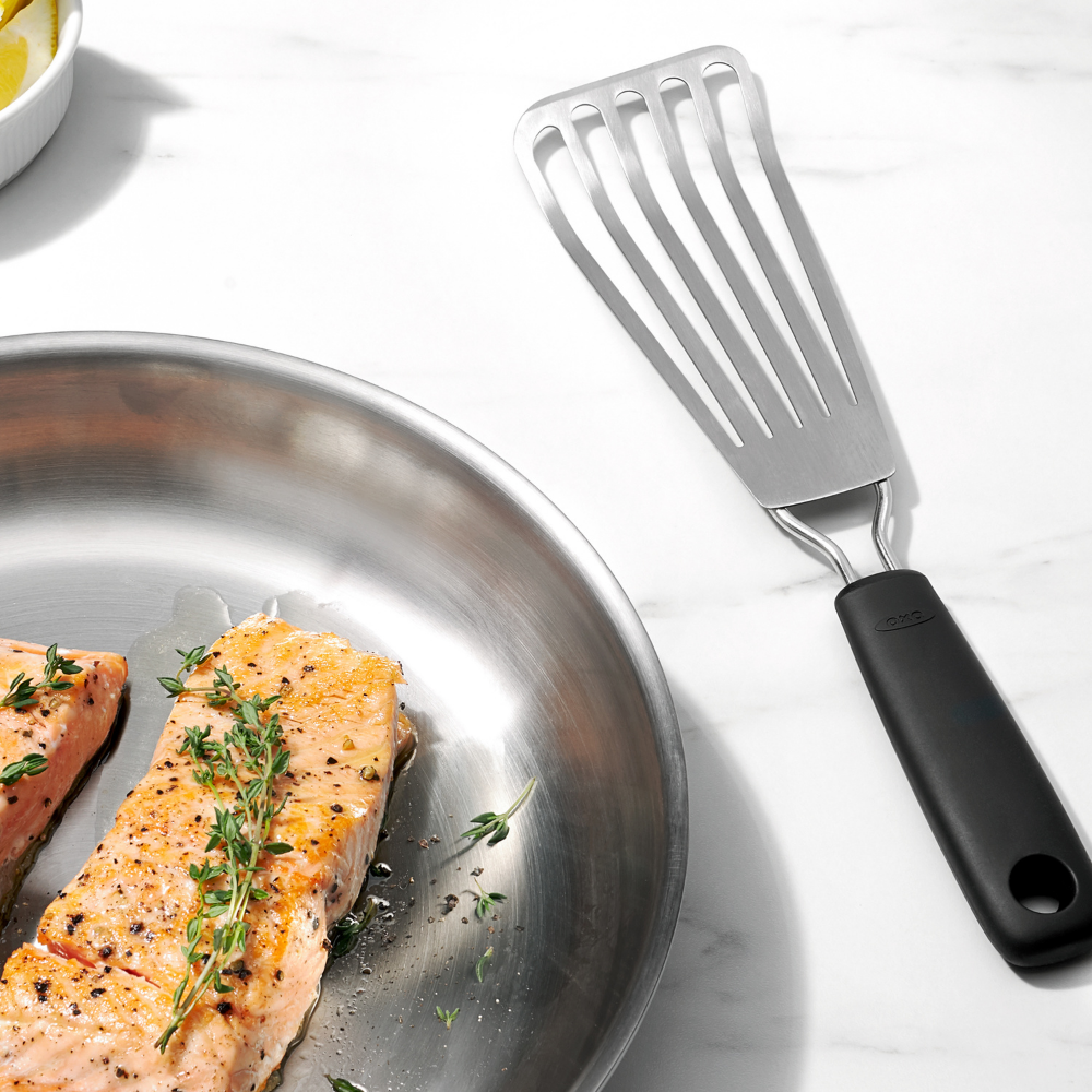 Χρησιμοποιήστε την σπάτουλα ψαριού OXO για το τηγάνισμα ψαριών Κατασκευασμένη από ανοξείδωτο ατσάλι και αντιολισθητική λαβή.