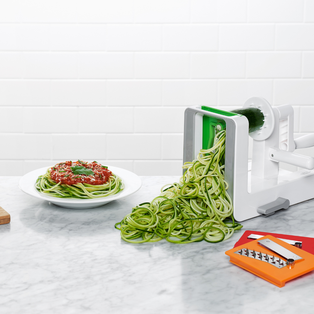 Ο επιτραπέζιος κόφτης λαχανικών OXO είναι τέλειος για τη δημιουργία νουντλς λαχανικών.Μπορείτε επίσης να το χρησιμοποιήσετε για να φτιάξετε ομοιόμορφες και εντυπωσιακές γαρνιτούρες για τις σαλάτες και γενικότερα τη διακόσμηση του πιάτου. Διαθέτει τρεις λεπίδες από ανοξείδωτο ατσάλι και μια βεντούζα Stronghold™ στο στήριγμα η οποία αποτρέπει την ταλάντωση στους πάγκους. Οι λεπίδες αποθηκεύονται σε ειδικό κουτί εξοικονομώντας χώρο.